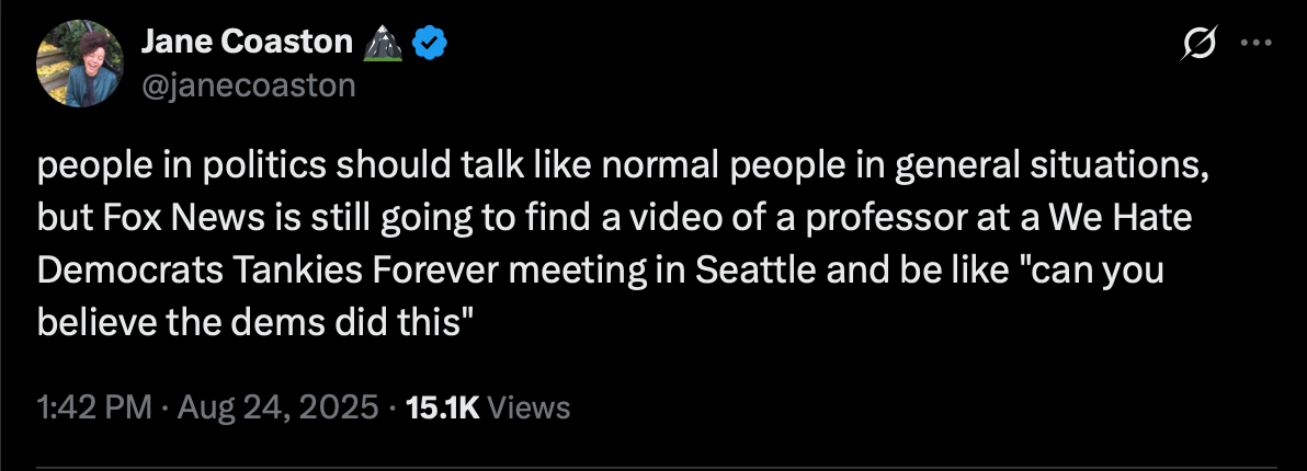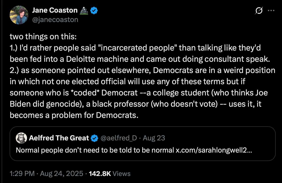 Now, her first point is pretty good … but the problem is that the last decade of Democratic politics has been less like a Deloitte machine and more like a progressive NGO seminar. Normal people felt pressure to talk in weird ways! We hit on this inauthenticity in The Democrats’ Other White Guy Problem.