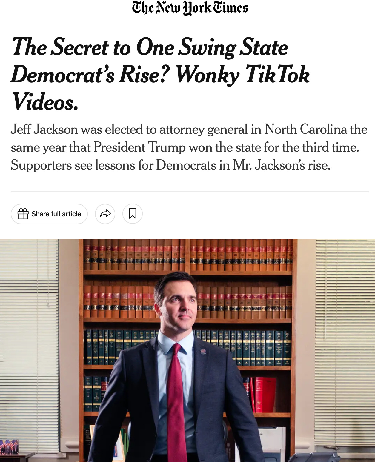 It was that clip, which attracted more than 30 million views, and dozens of similarly viral videos that helped Mr. Jackson, then a House Democrat, become North Carolina’s attorney general. He was elected to the post last fall even as President Trump took the swing state for the third time.