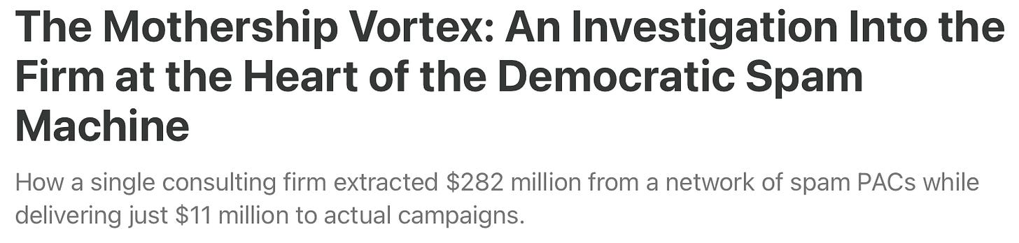 on the firm at the center of the Democratic digital fundraising disaster we’ve called “Tragedy of the Common Texts”. Here’s the punchline:My analysis of the network's FEC disbursements reveals that, at most, $11 million of the $678 million raised from individuals has made its way to candidates, campaigns, or the national party committees.
