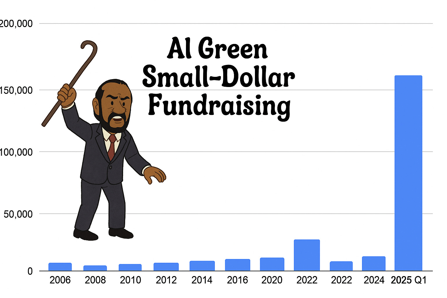 Rep. Al Green’s campaign filings with the Federal Election Commission shed some light on the fundraising impact. Over the twenty years from his first re-election bid in the 2006 cycle through 2024, Green raised less than $91,000 in contributions of less than $200.
