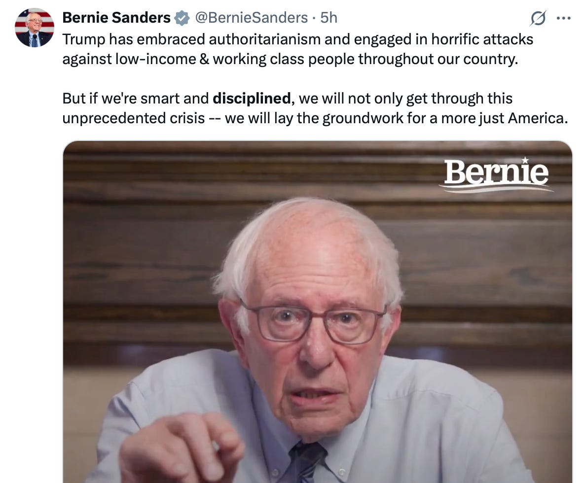 An 83 year old socialist isn’t my obvious pick in a moment of crisis, but two trustworthy sources have pointed to him in recent days. Both pointed to the same surprising word Sanders used: discipline.