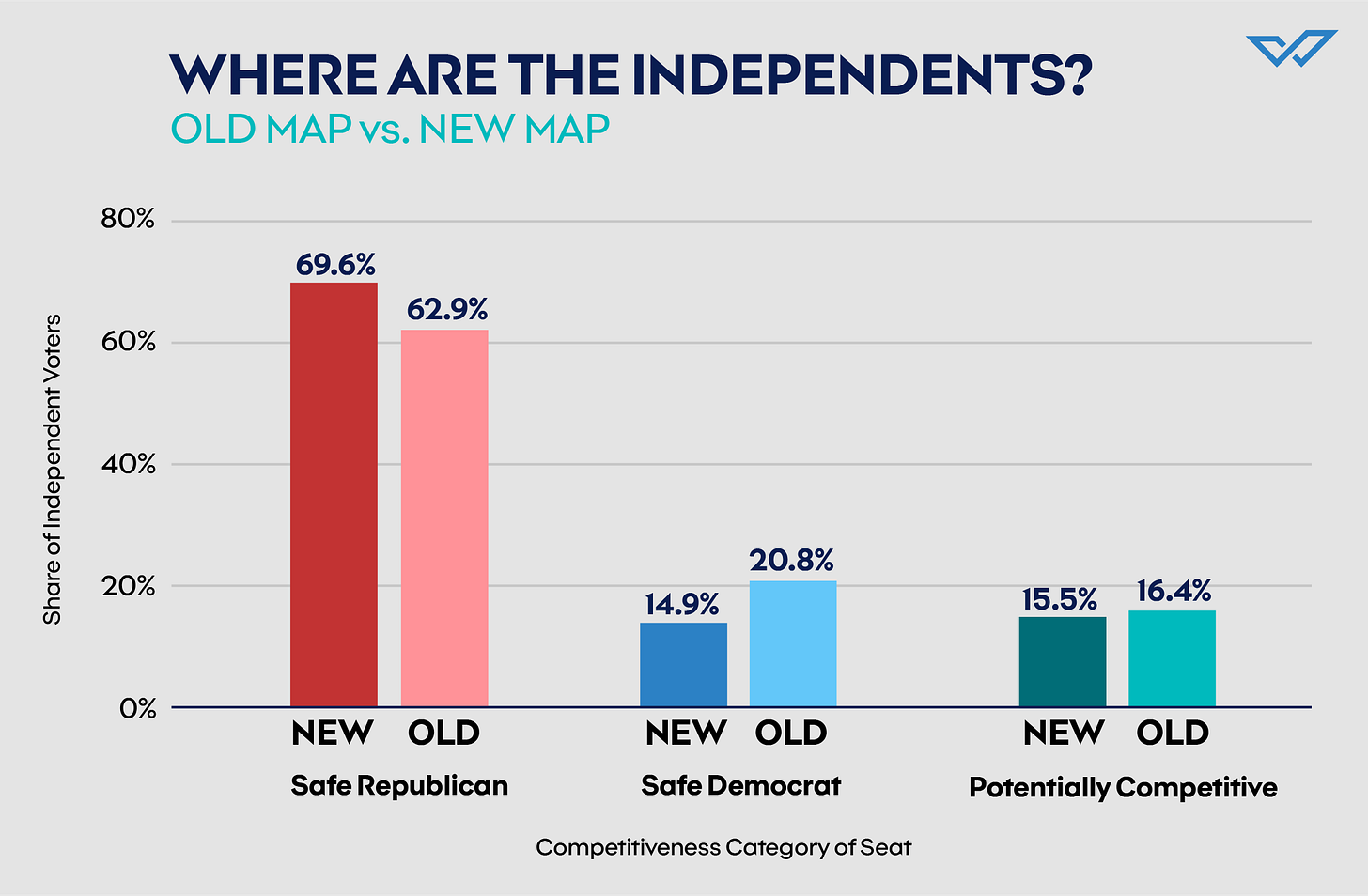 Just 15% of all modeled independents in the new map are in what we are calling “Potentially Competitive seats,” which are seats that went between Trump +20 and Harris +20.