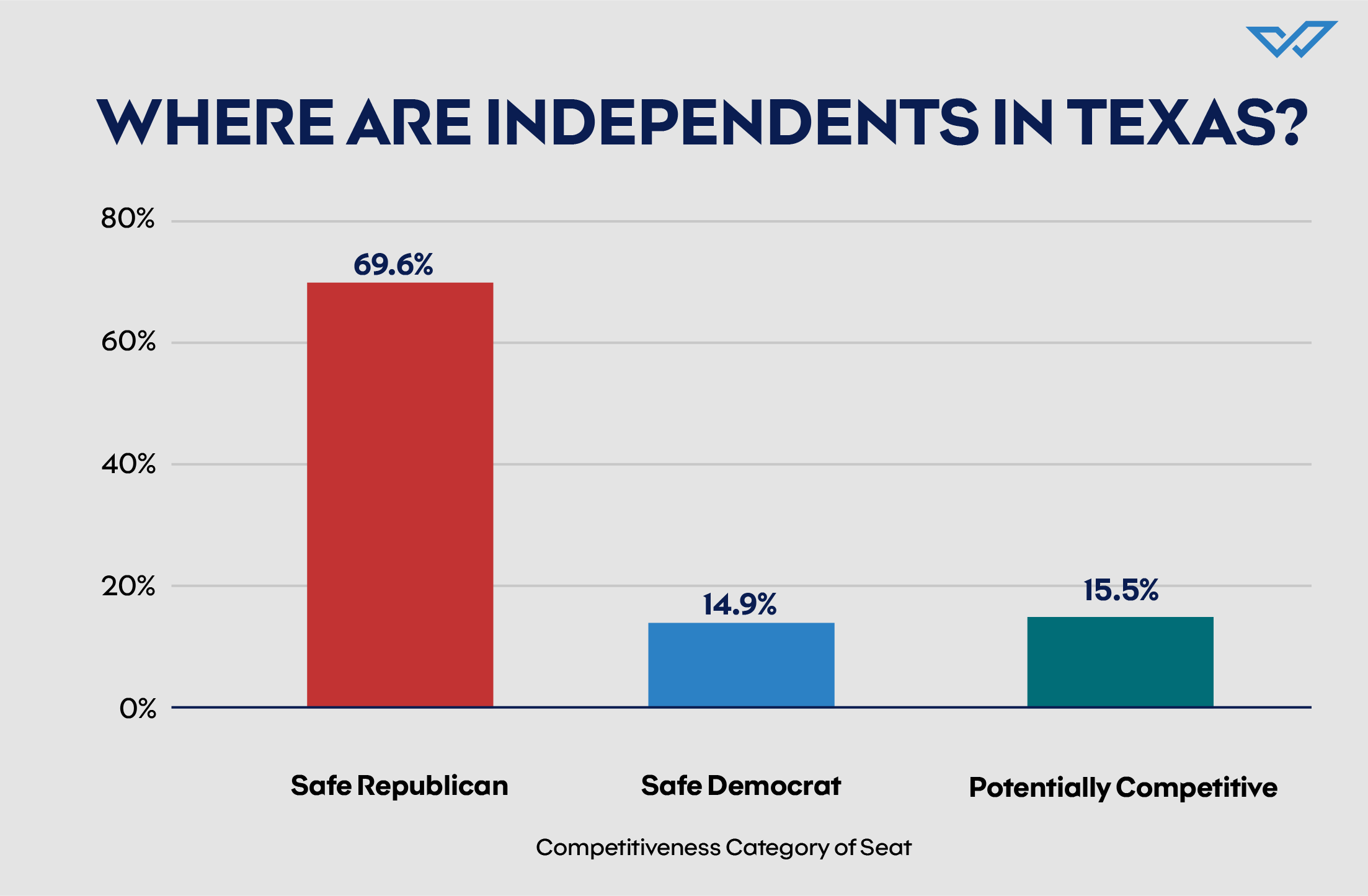 This may not be surprising, given that there are so many Safe Republican seats in Texas. However, when WDI analyzed the average partisan breakdown across all districts in these categories, further analysis shows that Potentially Competitive seats have the lowest share of independent voters in them. Only 11.6% of voters in Potentially Competitive seats are modeled independents, while 14.6% of voters in Safe Democratic seats are modeled independent and 17.4% of voters in Safe Republican seats are modeled independents.