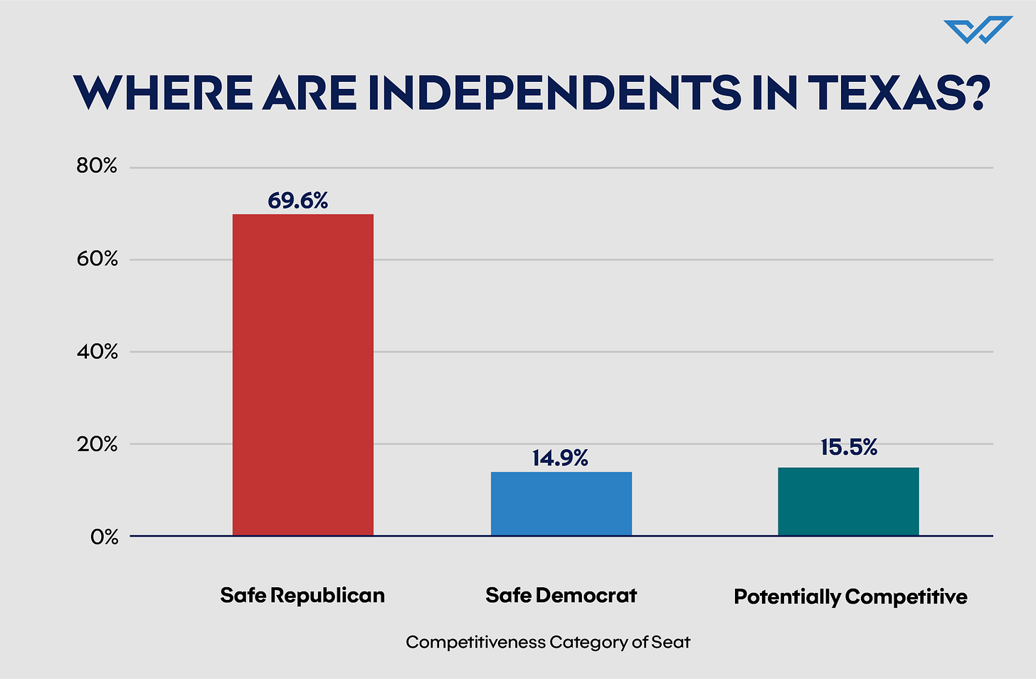 The Welcome Democracy Institute found that Texas’s Old Map had already diluted the power of independents but Texas’s New Map dilutes their power even more. For example, in the New Map, 24 of 38 Texas’s U.S. House seats would be winnable for the incumbent party even if ⅔ of likely nonpartisan voters support the opposing party.