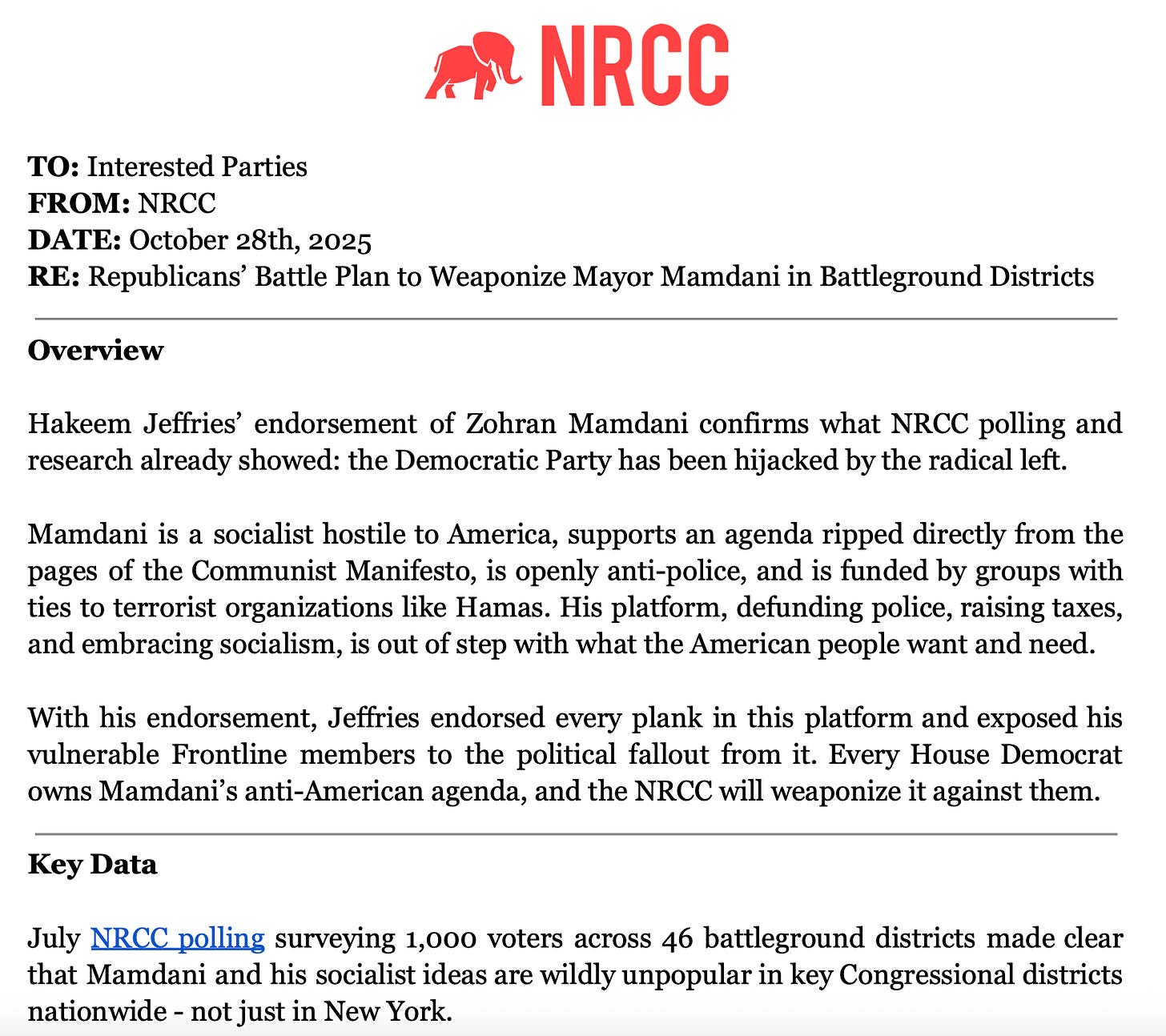 noted in the Wall Street Journal this morning, the national implications could be dire.The NRCC memo on “weaponizing Mamdani” echoes one of the earliest WelcomeStack posts four years ago: The Other Eastman Memo, the sad tale of Republicans successfully beating a “Brooklyn-style campaign” in a Democratic-leaning district.