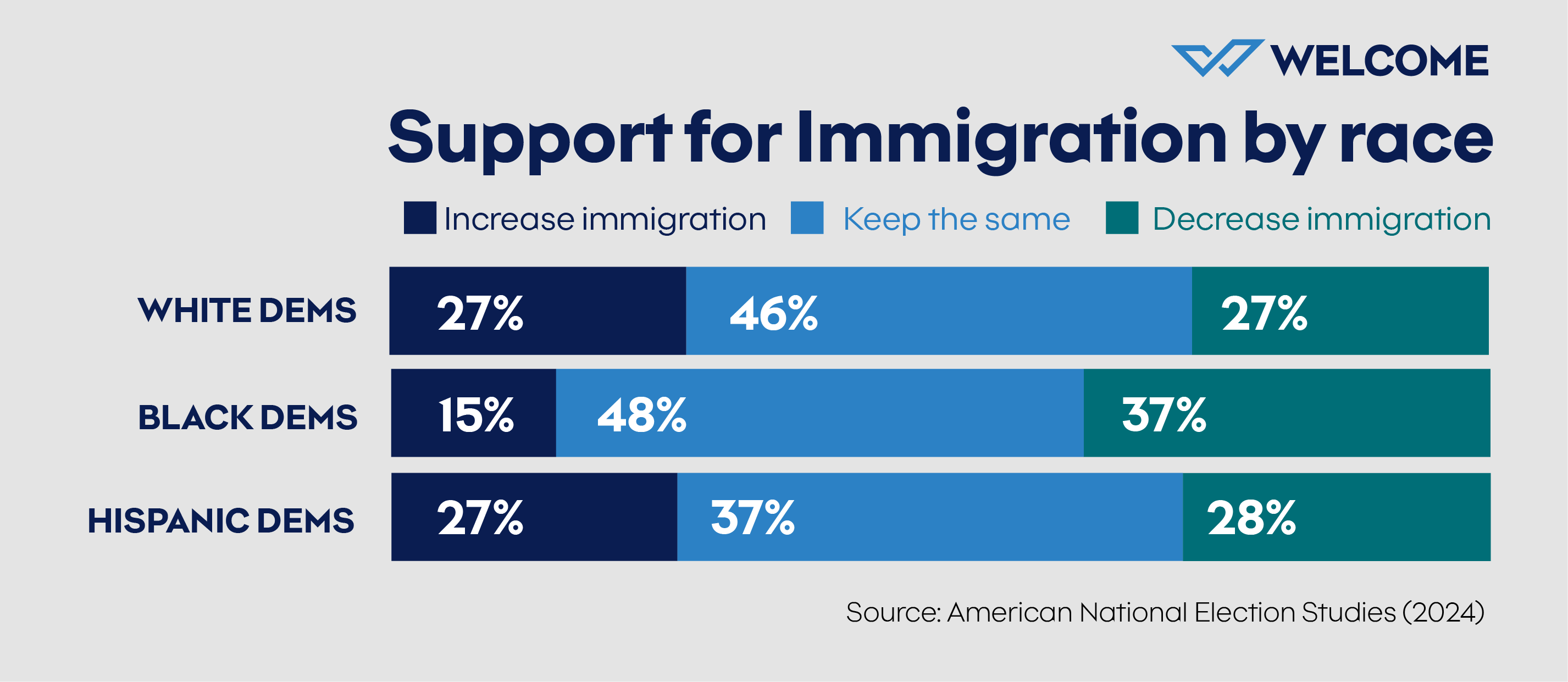 Take Black voters, which the media imagines to be a leftward force in the party: Even among Democrats and Democratic leaners, Black voters are moderate on many issues. Black Democratic voters are significantly more likely to express support for increasing the number of border patrols on the US-Mexico border (63%) than their white (47%) and Hispanic (50%) counterparts. In the 2024 American National Election Studies (ANES) data, white Democrats are more supportive of increasing immigration rates than Black and Hispanic Democrats.