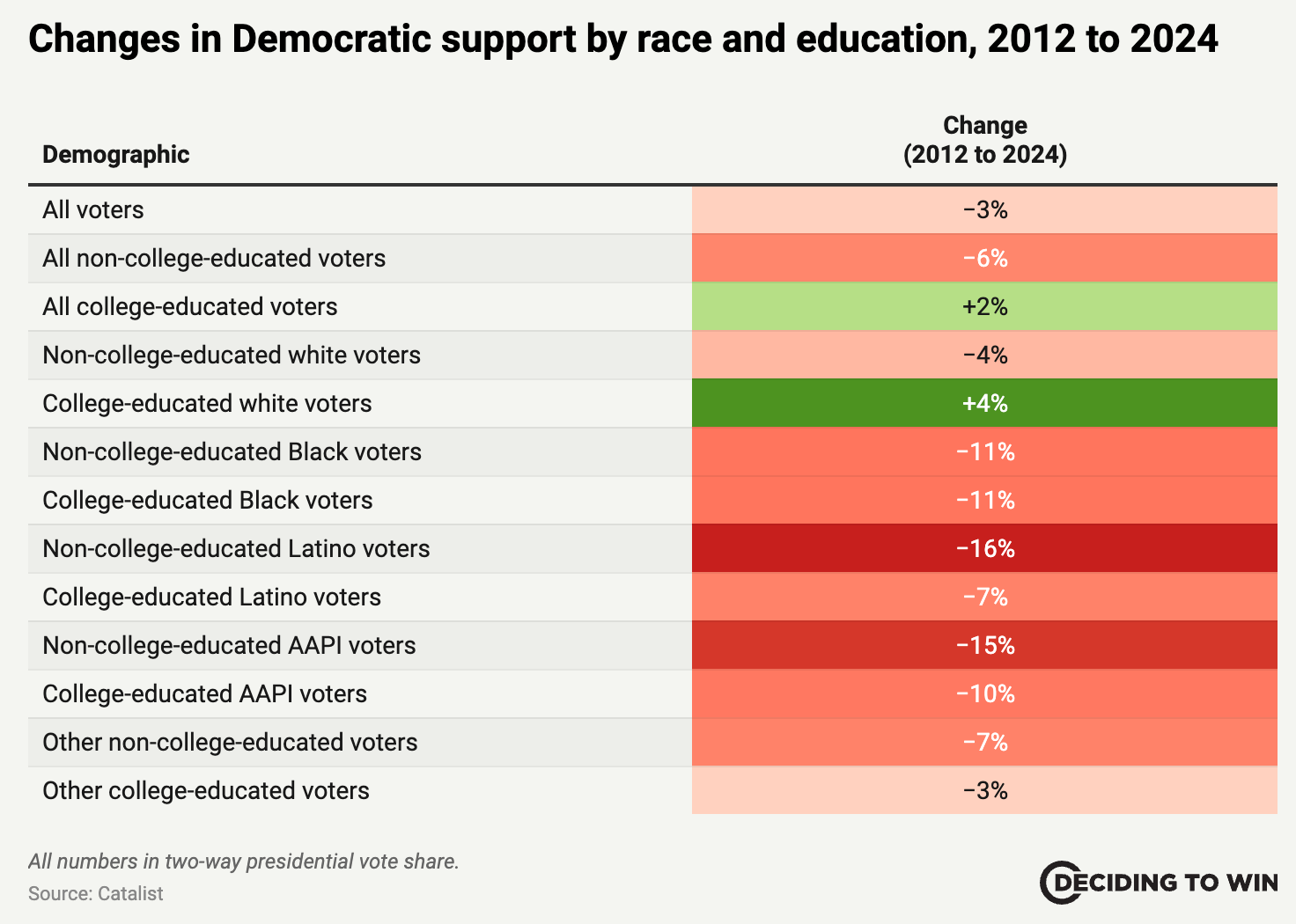 But these losses in particular have been piling up since 2012: Democrats have lost support among every race and college cohort except for college-educated white voters.