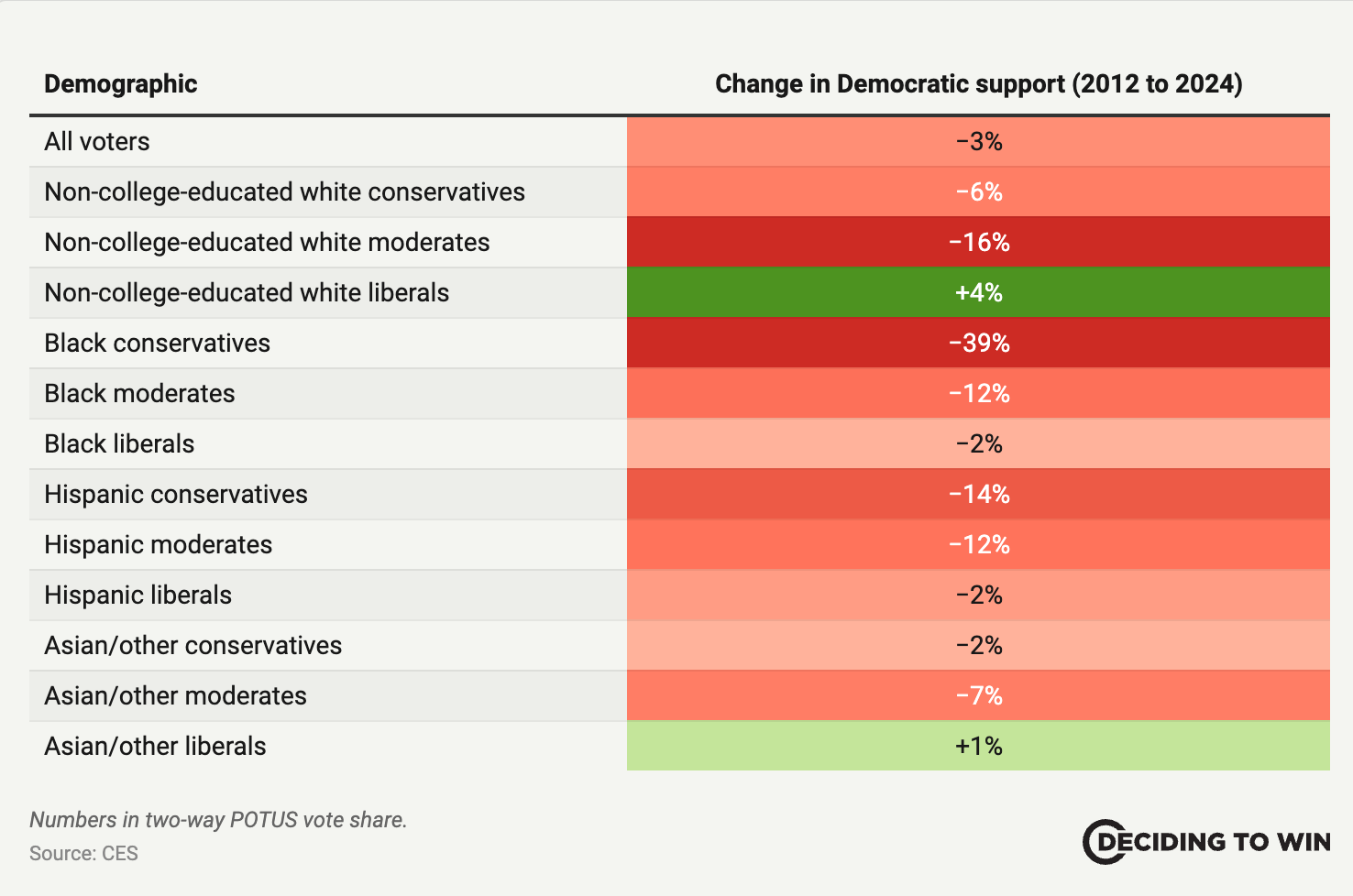 It’s something Democrats once thought unthinkable: in 2024, they lost vote share among Black and Hispanic voters in an election where Trump was on the ballot.