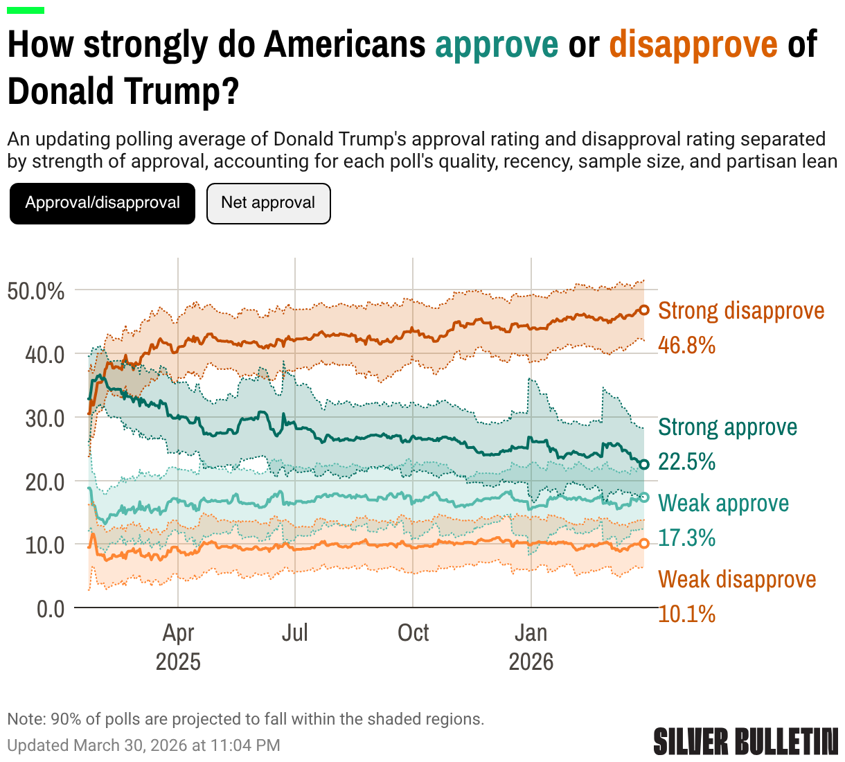 Pollsters often report “Net Approval” for the difference between approve and disapprove. Let’s refer to the difference between “Strong approve” and “Strong disapprove” as Net Intensity.