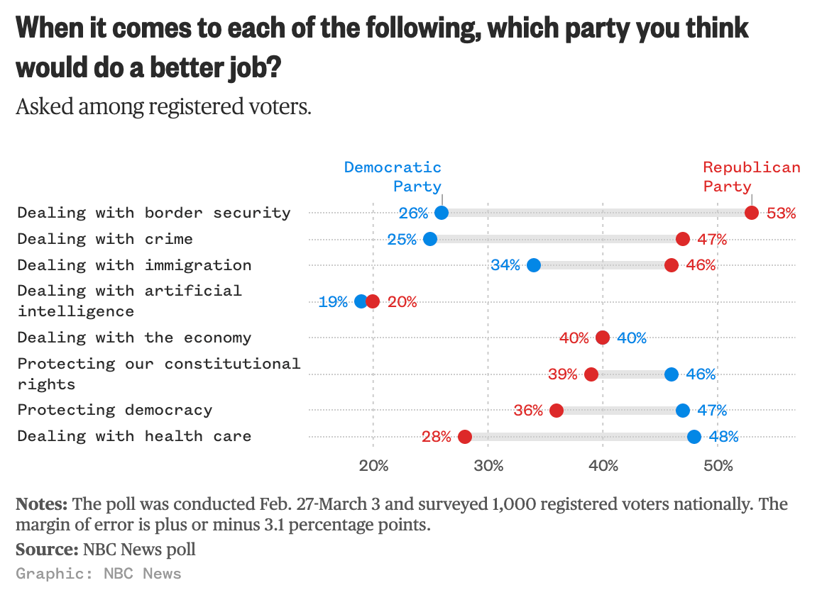 Even in polls that show Trump deeply unpopular and Democrats dominating the midterms, like this one from NBC News, the opposition is still not trusted on many priority issues.