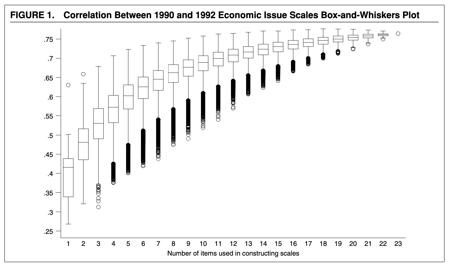 In their 2008 paper “The Strength of Issues: Using Multiple Measures to Gauge Preference Stability, Ideological Constraint, and Issue Voting,” Stephen Ansolabehere, Jonathan Rodden, and James M. Snyder Jr. argue that Converse’s conclusions are “driven largely by measurement error associated with the analysis of individual survey items” and that once you aggregate multiple survey items, “approximately half of the variance in responses across individuals within the typical issue item”—the change in responses to the same question from the same respondent over multiple survey waves “is attributable to measurement error.”